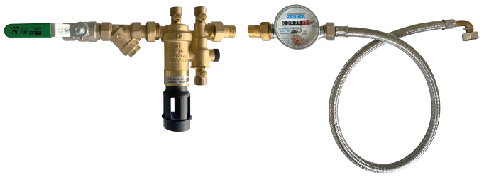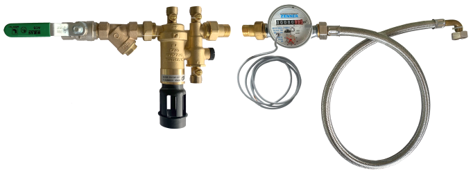 mit Absperrung, Schmutzfänger, Edelstahl-Rückschlagventil und Wassermengenzähler (bei vorhandenem Systemtrenner bzw. ohne Anforderung)